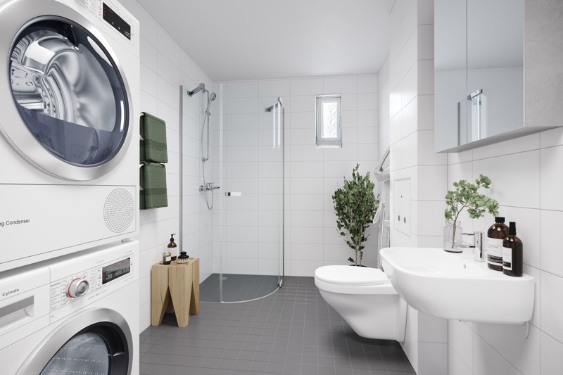 De helkaklade badrummen har klinkergolv och är utrustade med handdukstork, tvättmaskin och torktumlare. Samtliga renoverade lägenheter har nya, ljusa ytskikt med målade väggar och ekparkett i alla övriga rum.