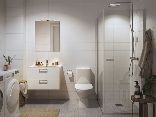 Badrummen är helkaklade med klinkergolv och erbjuder tvättmaskin och torktumlare i de större lägenheterna, medan de mindre lägenheterna har en kombinerad tvätt/torkmaskin.